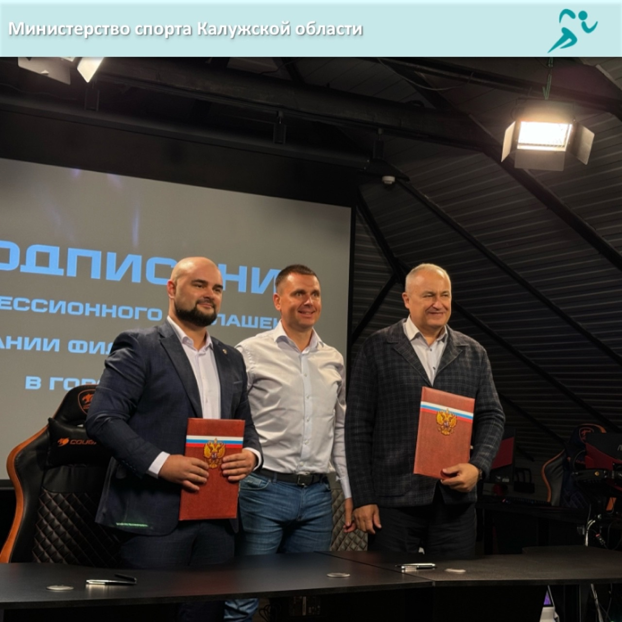 В многофункциональном спортивном комплексе «KFL-Арена» подписано концессионное соглашение о строительстве крупнейшего в России фиджитал-центра. В церемонии приняли участие министр спорта Калужской области Олег Сердюков, генеральный директор «Калужской футбольной лиги» Павел Мельников, а также другие почетные гости.