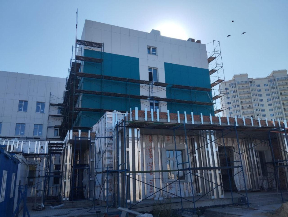В данный момент ведется отделка внутренних помещений. В кабинетах укладывают облицовочную плитку и напольные покрытия, в коридорах также идет укладка напольной плитки. Параллельно начался монтаж потолков с системами освещения.